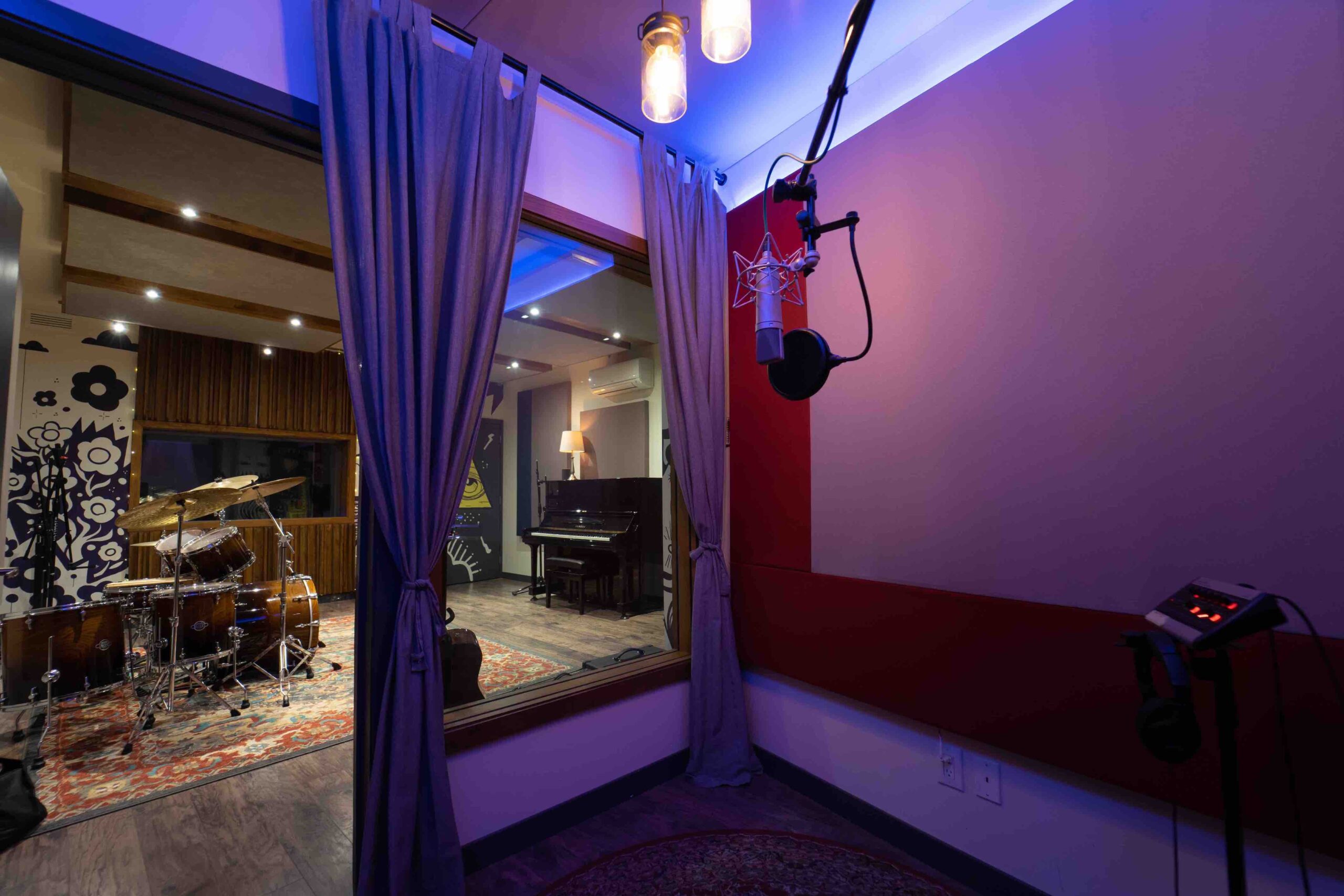 We left our shoes at the front door because their vibrations affect recording. Even the lights are dimmable because your mood affects your tone.  A couch and two stools are plush to help you relax so you can produce your most authentic sounds.